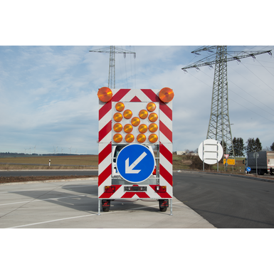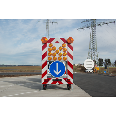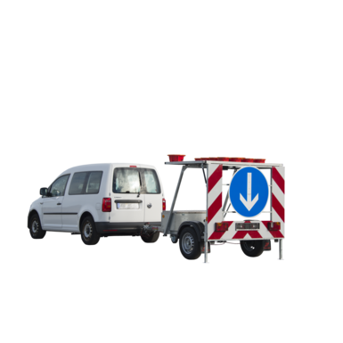 Mobilny szlaban FA 2 bez przestrzeni ładunkowej do stosowania na drogach z ruchem nadjeżdżającym. Zgodnie ze znakami ostrzegawczymi TL z małą wersją VZ 616, systemem podświetlanych strzałek wraz z przewodowym pilotem zdalnego sterowania z regulacją funkcji i elektromotoryczną regulacją VZ 222.