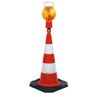 Wydajna lampa błyskowa LED. Do prostego i szybkiego montażu na dostępnych w handlu pachołkach drogowych TL o wysokości od 500 mm. Tuba na baterie dla 5 ogniw mono LR 20. Łatwa wymiana baterii dzięki systemowi wtykowemu.