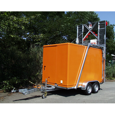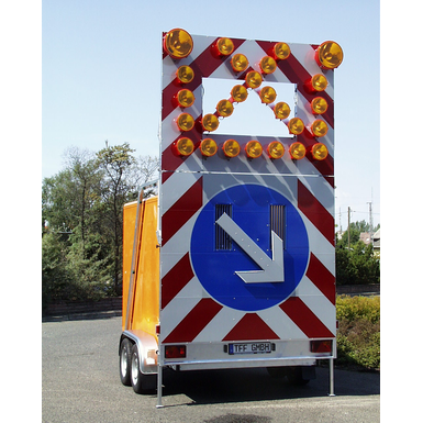 Mobilny panel bariery FA1 zamontowany za przyczepą skrzyniową.