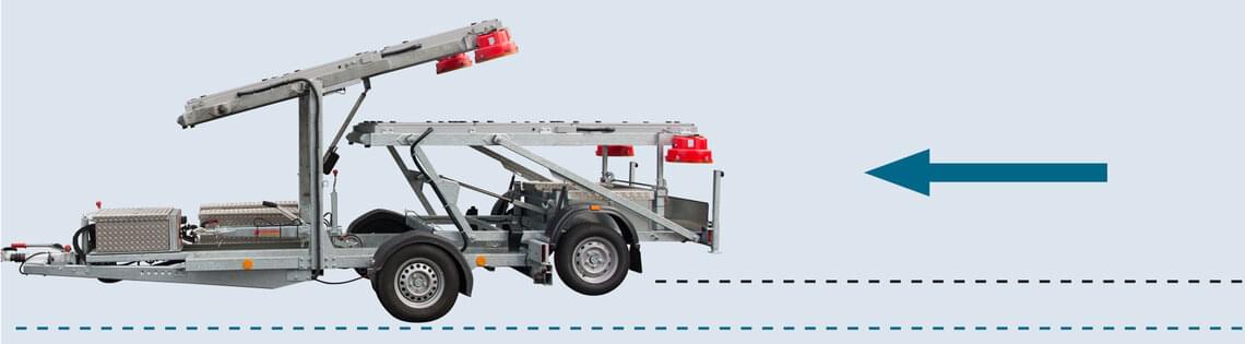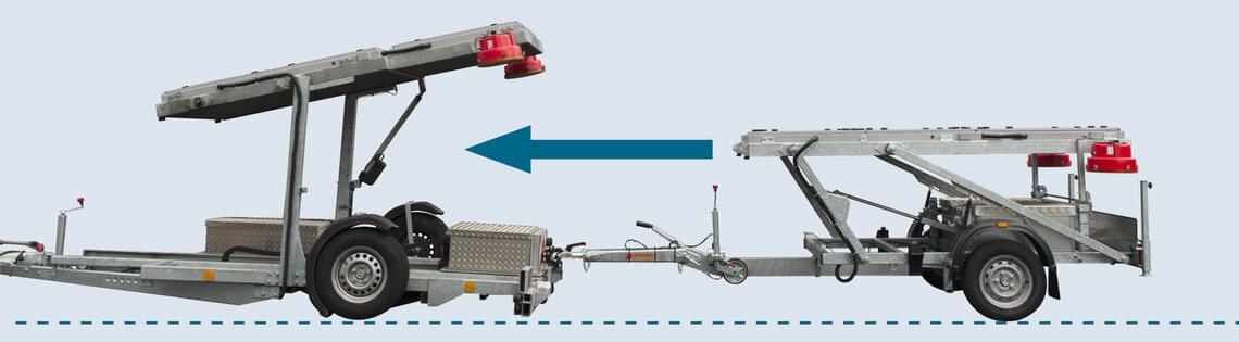 Oszczędność kosztów i czasu podczas korzystania z PickUp na placach budowy jest ogromna. Tam, gdzie wcześniej potrzebne były dwa pojazdy ratownicze i kilku pracowników, PickUp może być obsługiwany przez jedną osobę. Wskaźniki ostrzegawcze są ładowane i rozładowywane za pomocą prowadzonego urządzenia ciągnącego. Urządzenie VWA, które ma być ładowane, jest podłączane bezpośrednio do mobilnej skrzynki akumulatorowej i przesuwane elektrycznie do przodu za pomocą wciągarki linowej z funkcją kabestanu. Ta funkcja ładowania może być sterowana z boku podbieracza - kolejna specjalna funkcja bezpieczeństwa. Po załadowaniu pojazdu VWA, tablica ta może być nadal ustawiona tak, aby ostrzegać o ruchu za pojazdem, tak aby ruch drogowy był bezpiecznie prowadzony obok pojazdu i kierowcy. Oszczędność dodatkowego pojazdu holowniczego nie tylko obniża koszty, ale także zmniejsza emisję CO2, a tym samym zmniejsza zanieczyszczenie środowiska. Praktyczna jednostka elektrohydrauliczna z ważną awaryjną pompą ręczną łączy w sobie prostą i niezawodną obsługę osi podnoszonej - nawet w przypadku awarii zasilania. Dyszel z regulacją wysokości i hamulcem najazdowym z uchem holowniczym zatwierdzonym przez DIN, zaczepem kulowym i hydraulicznym opuszczaniem osi gwarantuje szybkie i łatwe dołączanie i odłączanie. Mocowanie do szerokiej gamy typów pojazdów zapewnia zatem pewien stopień elastyczności i mobilności zarówno dla kierowcy, jak i pojazdu. Szczególnie wytrzymały materiał PickUp wykonany ze stali ocynkowanej ogniowo i aluminiowej blachy falistej idealnie nadaje się do użytku w miejscach pracy. Znaki zmiennej treści LED na górnym i dolnym panelu VWA są wyświetlane w kolorach RGB i w pełnej matrycy. Znaki zmiennej treści na VWA mogą być obsługiwane i sterowane za pomocą nowoczesnego i przyjaznego dla użytkownika pilota radiowego z ekranem dotykowym. Ze względów bezpieczeństwa urządzenie holownicze pick-upa jest nadal sterowane za pomocą pilota kablowego.